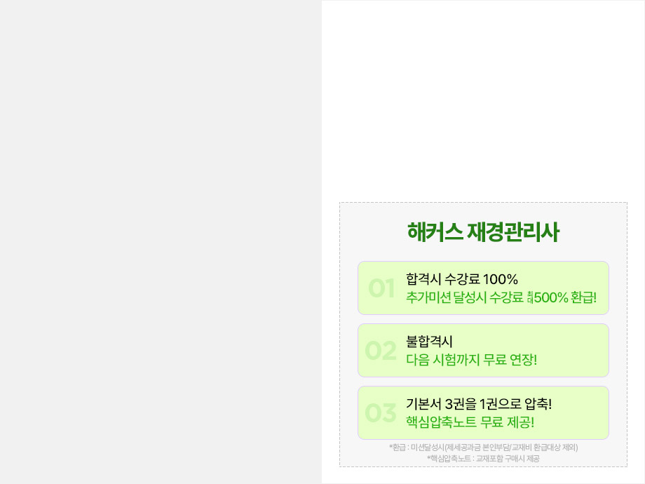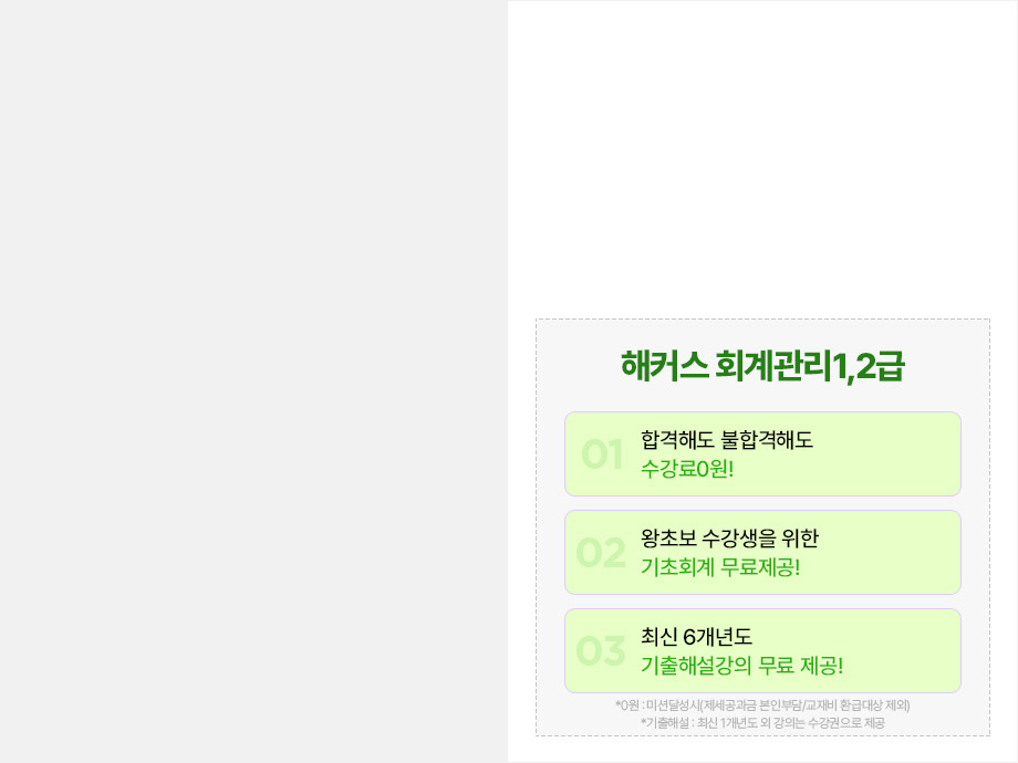 ¡Ø ¾Ë¸² ½Åû½Ã ÇØÄ¿½º Àç°æ°ü¸®»ç¡¤È¸°è°ü¸® °¡´ä¾È ¼ºñ½º ½ÃÀÛ ¾È³» ¾Ë¸²ÅåÀÌ ¹ß¼ÛµÉ ¿¹Á¤ÀÔ´Ï´Ù. ¡Ø ȸ¿ø Á¤º¸¿¡ µî·ÏµÈ ÈÞ´ëÀüÈ ¹øÈ£ ±âÁØÀ¸·Î ¹ß¼ÛµÇ¸ç, ȸ¿ø Á¤º¸ ¿ÀÀԷ¿¡ µû¸¥ ¾Ë¸²Åå ¹Ì¹ß¼ÛÀº ÇØÄ¿½º°¡ Ã¥ÀÓÁöÁö ¾Ê½À´Ï´Ù. ¡Ø ¾Ë¸² ½Åû½Ã, [Àç°æ°ü¸®»ç ÀûÁ߸ðÀǰí»ç 1ȸ] ¹× [ȸ°è°ü¸®1,2±Þ Çٽɿä¾àƯ°] ¹× [ȸ°èÀÚ°ÝÁõ Àΰ 10¸¸¿ø ÄíÆùÆÑ]ÀÌ Á¦°øµË´Ï´Ù. - Àç°æ°ü¸®»ç ÀûÁ߸ðÀǰí»ç´Â PDF ÆÄÀÏ·Î Á¦°øµË´Ï´Ù. ȸ°è°ü¸®1/2±Þ Çٽɿä¾àƯ°Àº ¼ö°±ÇÀ¸·Î Áö±ÞµË´Ï´Ù. - ȸ°è°ü¸®1,2±Þ Çٽɿä¾àƯ°Àº 7Àϰ£ ¼ö° °¡´ÉÇϸç, ÀçÁö±Þ ºÒ°¡ÇÕ´Ï´Ù. - Àç°æ°ü¸®»ç/ȸ°è°ü¸®/Àü»ê¼¼¹«È¸°è/ATÀڰݽÃÇè ÇÒÀÎÄíÆùÀº ÀϺΠÀ̺¥Æ® °ÀÇ¿¡¸¸ Àû¿ë °¡´ÉÇϸç, 3Àϰ£ »ç¿ëÇÏ½Ç ¼ö ÀÖ½À´Ï´Ù. ¡å»ç¿ë °¡´ÉÇÑ ÄíÆù¡å Àç°æ°ü¸®»ç 100% ȯ±ÞÆÐ½º 3¸¸¿ø ÇÒÀÎÄíÆù Àç°æ°ü¸®»ç 500% ȯ±ÞÆÐ½º 3¸¸¿ø ÇÒÀÎÄíÆù Àç°æ°ü¸®»ç 3°³¿ù ÇÕ°ÝÆÐ½º 1¸¸¿ø ÇÒÀÎÄíÆù ȸ°è°ü¸® 3°³¿ù ÇÕ°ÝÆÐ½º 1¸¸¿ø ÇÒÀÎÄíÆù ATÀڰݽÃÇè ´Ü±âÇÕ°Ý¹Ý 2¸¸¿ø ÇÒÀÎÄíÆù ¡Ø ½ÃÇè´çÀÏ Á¦°ø ÄíÆù ¾È³» - ¾Ë¸²Åå ½ÅûÀÚ ´ë»óÀ¸·Î ½ÃÇè´çÀÏ~½ÃÇèÁ÷ÈÄ ¿ù¿äÀÏ ¿ÀÀü 9½Ã±îÁö¸¸ Ưº° ÄíÆù Áö±ÞµË´Ï´Ù. - Àç°æ°ü¸®»ç/ȸ°è°ü¸®/Àü»ê¼¼¹«È¸°è/ATÀڰݽÃÇè ÇÒÀÎÄíÆùÀº ÀϺΠÀ̺¥Æ® °ÀÇ¿¡¸¸ Àû¿ë °¡´ÉÇϸç, 3Àϰ£ »ç¿ëÇÏ½Ç ¼ö ÀÖ½À´Ï´Ù. ¡å»ç¿ë °¡´ÉÇÑ ÄíÆù¡å Àç°æ°ü¸®»ç ȯ±Þ¹Ý 7¸¸¿ø ÇÒÀÎÄíÆù Àç°æ°ü¸®»ç ȸ°è°ü¸®1±Þ 7¸¸¿ø ÇÒÀÎÄíÆù ATÀڰݽÃÇè ´Ü±âÇÕ°Ý¹Ý 5¸¸¿ø ÇÒÀÎÄíÆù Àü»ê¼¼¹«È¸°è ȯ±Þ¹Ý 4¸¸¿ø ÇÒÀÎÄíÆù ¡Ø ½ÃÇèÈı⠼ҹ®³»±â À̺¥Æ® ÇýÅà ½ÃÇè´çÀÏ ½ÃÇèÈıâ ÀÔ·ÂÇϰí, ¼Ò¹®³»±â À̺¥Æ® Âü¿©½Ã Ãß÷À» ÅëÇØ ½Ç¹°ÇýÅÃÀÌ Á¦°øµË´Ï´Ù. *Ãß÷À» ÅëÇØ ´ç÷µÇ¸ç, ¼Ò¹®³»±â À̺¥Æ®¿¡ ¸¹ÀÌ Âü¿©Çҽà ´ç÷ È®·ü ³ô¾ÆÁý´Ï´Ù. ³×À̹öÆäÀÌ 1,000¿ø - 10¸í Ãß÷ ¸Þ°¡Ä¿ÇÇ ¾ÆÀ̽º¾Æ¸Þ¸®Ä«³ë - 5¸í Ãß÷ ½ºÅ¸¹÷½º ±³È¯±Ç - 1¸í Ãß÷ |