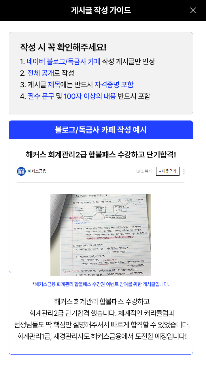 ¡á ¼ö°·á 100% ȯ±Þ: ±¸¸Å ´ç½Ã ¼±ÅÃÇÑ ÀÚ°ÝÁõÀÇ ¼±Åà ȸÂ÷ ½ÃÇè ÇÕ°Ý/ºÒÇÕ°ÝÈÄ, ȯ±Þ½Åû±â°£ ³» Á¤»óÀûÀ¸·Î ½Åû½Ã ¼ö°·á°¡ 100% ȯ±ÞµË´Ï´Ù. 1. ȯ±Þ ½Åû ±â°£ : ÇÕ°ÝÀÚ ¹ßÇ¥ÀÏ Æ÷ÇÔ 7ÀÏ ³» ȯ±Þ ½Åû °Ô½ÃÆÇ¿¡¼ ÀÎÁõ ¨Í 3¿ù´ëºñ¹Ý : 4/3(±Ý) ~ 4/9(¸ñ) ¨Î5¿ù´ëºñ¹Ý : 5/22(±Ý) ~ 5/28(¸ñ) ¨Ï6¿ù´ëºñ¹Ý : 6/26(±Ý) ~ 7/2(¸ñ) ¡Ø ÀºÇà Á¡°Ë ½Ã°£ (23:40~00:30)µ¿¾ÈÀº ȯ±Þ ½ÅûÀÌ ºÒ°¡ÇÏ¿© ÇØ´ç ½Ã°£À» ÇÇÇÏ¿© ½ÅÃ»ÇØÁֽñ⠹ٶø´Ï´Ù ¡Ø ¡Ø ȯ±Þ ½Åû ÀÎÁõ ±â°£ÀÓÀ» º°µµ·Î ¾È³»ÇÏÁö ¾Ê½À´Ï´Ù. 2. ȯ±Þ ½Åû ¹æ¹ý : [¸¶ÀÌŬ·¡½º]¢º[ȯ±Þ½Åû]¢º[ȸ°è°ü¸®1±Þ ÇÕºÒ0¿øÆÐ½º] ÆË¾÷âÀ» ÅëÇØ ÇÕ°Ý »ç½ÇÀ» ÀÎÁõÇØÁÖ¼¼¿ä. ÃÖÁ¾ °ËÅä ¿Ï·á±îÁö ¾à ÇÑ ´Þ °¡·® ½Ã°£ÀÌ ¼Ò¿äµÉ ¼ö ÀÖ½À´Ï´Ù. ¡Ø ȯ±Þ ½ÅûÀº PC ÆäÀÌÁö¿¡¼¸¸ ½ÅûÀÌ °¡´ÉÇÏ¸ç ¸ð¹ÙÀϷδ ½ÅûÀÌ ºÒ°¡ÇÕ´Ï´Ù. 3. ȯ±Þ ½Åû ½Ã Çʵ¶ À¯ÀÇ»çÇ× ±¸¸Å ´ç½Ã ¼±ÅÃÇÑ ÀÚ°ÝÁõÀÇ ¼±Åà ȸÂ÷ ½ÃÇè¿¡¼ ÇÕ°ÝÇÑ ÈÄ ÇÕ°Ý/ºÒÇÕ°Ý ÀÎÁõÀÌ ¿Ï·áµÇ¾î¾ß ȯ±Þ¹ÞÀ¸½Ç ¼ö ÀÖ½À´Ï´Ù. ÀÌ¿ÜÀÇ ½ÃÇè ÇÕ°ÝÀº ÀÎÁ¤µÇÁö ¾Ê½À´Ï´Ù. (ÇØ´ç ±âÁØÀ» ÃæÁ·ÇÏÁö ¸øÇÒ °æ¿ì, ȯ±ÞµÇÁö ¾ÊÀ½À» À¯ÀÇ) ¼±ÅÃÇÏ½Å ÇØ´ç ¿ù ½ÃÇè Àü¿¡ Á¶±â ÇÕ°ÝÇÏ¿©µµ ȯ±ÞÀº ºÒ°¡ÇÕ´Ï´Ù. ºÒÇÕ°Ý È¯±ÞÀÇ °æ¿ì ¼±ÅÃÇÑ ÇØ´ç ¿ù ½ÃÇè ÀÀ½Ã ÀÎÁõ, ÀÀ½ÃÇÑ ½ÃÇè¿¡¼ Æò±Õ 50Á¡ ÀÌ»ó ´Þ¼º, ¼ö°°ú¸ñÀÇ ÇÙ½ÉÁ¤¸®+±âÃâ¹®Á¦ ÁøµµÀ² °¢°¢ 100% ´Þ¼º ½Ã¿¡ ȯ±Þ °¡´ÉÇÕ´Ï´Ù. (*ÇØ´ç½ÃÇè ¹ÌÁ¢¼ö,°á½Ã,0Á¡¿¡ ÇØ´çÇÏ´Â °æ¿ì À§ ÁøµµÀ²À» ÃæÁ·Ç߾ ºÒÇÕ°Ý È¯±ÞÀÌ ºÒ°¡ÇÕ´Ï´Ù.) ÇÔ²² Á¦°øµÇ´Â Çٽɿä¾à°ÀÇ ¹× ¼ö°±Ç ÇýÅÃÀ» ÅëÇØ Á¦°øµÇ´Â ±âÃâÇØ¼³°ÀÇÀÇ ÁøµµÀ²Àº ȯ±Þ°ú °ü°è¾ø½À´Ï´Ù. ¡ØÁøµµÀ² : ¼ö° ¿Ï·áµÈ °ÀÇ ¼ö (*¼ö°·ü 100% ä¿î °ÀÇ °³¼ö)/Àüü °ÀÇ ¼ö ¡ØÁøµµÀ² ´Þ¼º ±â°£ : ±¸¸Å ´ç½Ã ¼±ÅÃÇÑ ÀÚ°ÝÁõ ½ÃÇèÀÏ Àü³¯±îÁö 4. ±âŸ À¯ÀÇ»çÇ× : 1) ÇÕ°Ý/ºÒÇÕ°Ý ÀÎÁõ »çÁø ³» ¼ºÇÔ°ú ¹«ÅëÀå ÀÔ±Ý ½Ã¿¡ ȯ±Þ¹ÞÀ» °èÁ¹øÈ£/¿¹±ÝÁÖ°¡ ¸ðµÎ º»ÀÎÀ̾î¾ß ÇÕ´Ï´Ù. (*ÇØÄ¿½º±ÝÀ¶ »çÀÌÆ®¿¡ µî·ÏµÈ ȸ¿ø°ú ½ÃÇè ÀÀ½ÃÀÚ°¡ µ¿ÀÏÇØ¾ß ÇÕ´Ï´Ù.) 2) ºÒÇÕ°Ý ÀÎÁõ ½Ã ºÒÇÕ°ÝÀÚ ¼º¸í/¼öÇè¹øÈ£/Á¡¼ö Æ÷ÇÔÇÑ ºê¶ó¿ìÀú âÀ» ĸÃÄÇÏ¼Å¾ß ÇÕ´Ï´Ù. 3) ȯ±Þ ½Åû ÀοøÀÌ ¸¹À» °æ¿ì, 2~3ÁÖ°£ ¼Ò¿äµÉ ¼ö ÀÖ½À´Ï´Ù. 4) ±¹°¡ ¼ö°·á Áö¿ø ´ë»óÀÎ °æ¿ì Áߺ¹ÇÏ¿© ȯ±Þ ¹ÞÀ» ¼ö ¾ø½À´Ï´Ù. 5) Á¤È®ÇÑ ÀڰݽÃÇè ÇÕ°Ý/ºÒÇÕ°ÝÀÎÁõÀÌ µÇÁö ¾ÊÀ¸¸é ȯ±ÞÁ¶°ÇÀÌ ÃæÁ·µÇÁö ¾Ê½À´Ï´Ù. 6) ÀڰݽÃÇè ÇÕ°ÝÀÎÁõ ³»¿ëÀÌ ÇãÀ§·Î µå·¯³¯ °æ¿ì, ¹Î/Çü»ç»ó Ã¥ÀÓÀ» Áú ¼ö ÀÖ½À´Ï´Ù. 7) ȯ±ÞÀº °áÁ¦ÇϽмö´ÜÀ¸·Î ÁøÇàµË´Ï´Ù. 5. ȯ±Þ ó¸® ¾È³» : 1) ½Å¿ëÄ«µå °áÁ¦ÇÑ °æ¿ì, Ä«µå °áÁ¦ ³»¿ª¿¡¼ ȯºÒ ó¸® µË´Ï´Ù. 2) ¹«ÅëÀåÀÔ±ÝÀ» ÅëÇØ °áÁ¦ÇÑ °æ¿ì ¶Ç´Â ½Å¿ëÄ«µå·Î °áÁ¦Çß´õ¶óµµ SAVE Æ÷ÀÎÆ® °áÁ¦/ÇØ¿ÜÄ«µå °áÁ¦/¿¡Å©½º·Î(¾ÈÀü°áÁ¦) ȯ±Þ ½Åû ½Ã¿¡ [¿¹±ÝÁÖ(ȯ±Þ½ÅûÀÚ¸íÀÇ), ÀºÇà¸í,°èÁ¹øÈ£] Á¤º¸¸¦ ÀÔ·ÂÇØÁÖ¼Å¾ß È¯±Þ °¡´ÉÇÕ´Ï´Ù. 3) (°áÁ¦±Ý¾×-±³Àç±Ý¾×)*78% ÀÇ ±Ý¾×ÀÌ È¯±ÞµË´Ï´Ù. (22% Á¦¼¼°ø°ú±ÝÀÌ °øÁ¦µÇ¸ç, ±³Àç °¡°Ý Á¦¿Ü ÈÄ È¯±Þ) ¡Ú26³â ±³Àç´Â ¾ÆÁ÷ Ãâ°£µÇÁö ¾ÊÀº ±³Àç·Î Àü³âµµ ±³Àç °¡°Ý ±âÁØÀ¸·Î ±âÀçµÇ¾î ÀÖÀ¸¸ç, °¡°Ý º¯°æµÉ ¼ö ÀÖ½À´Ï´Ù. Ãâ°£½Ã ½ÇÁ¦ Ãâ°£±³Àç ±Ý¾×À¸·Î °øÁ¦µË´Ï´Ù. ¡Ø ȯ±Þ½Ã °øÁ¦µÇ´Â ±³Àç ±Ý¾× 1) ȸ°è°ü¸®1±Þ À繫ȸ°è : 24,300¿ø 2) ȸ°è°ü¸®1±Þ ¼¼¹«È¸°è : 24,300¿ø 3) ȸ°è°ü¸®1±Þ ±âÃâ¹®Á¦Áý : 24,300¿ø ¡ÚÁÖÀÇ¡Ú ÇØÄ¿½º ±ÝÀ¶¿¡¼´Â ȯ±Þ ½Åû ±â°£ÀÎ Á¡, ȯ±Þ ½ÅûÀÌ ¹Ý·ÁµÈ Á¡¿¡ ´ëÇØ º°µµ·Î ¾È³»µå¸®Áö ¾Ê½À´Ï´Ù. |